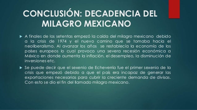 Si bien las medidas aplicadas durante el Milagro Mexicano trajeron grandes beneficios durante 30 años se convirtieron en una bomba de tiempo que explotó en los años sucesivos a la década de los 70. En el tema se habla de la gran época de prosperidad desarrollo y crecimiento económico en México conocida como el Milagro Mexicano. Asimismo se analiza los errores del milagro económico mexicano que se enfatiza en los métodos y prácticas que se realizaron durante esta época mediante las cuales fueron las que.
