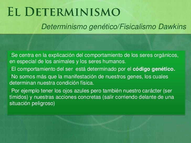 Não se trata de uma forma de determinismo precisa mas é uma teoria que afirma que os genes e as condições genéticas de uma pessoa determinam a sua vida. Haz clic aquí para obtener una respuesta a tu pregunta a quienes beneficiaba la teoría del determinismo en el siglo XIX.